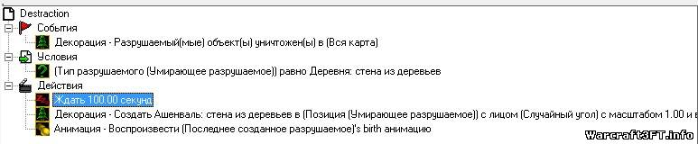 | Cool_Boy, Есть 2 варианта. Первый: Событие - Декорация из летних деревьев 0000 <gen> уничтожен Условие - ( пусто ) Действие - ждать 5 сек Декорация - создать стена из летнех деревьев в позиция ( последнее разрушимое ) Второй через области. Событие - Декорация из летних деревьев 0000 <gen> уничтожен Условие - ( пусто ) Действие - ждать 5 сек Декорация - создать стена из летнех деревьев в области ( твоя область ) А ошибка у тебя в событии и зачем тебе условие? Не мучай карту.